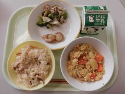 今日の献立は、ごもくごはん・牛乳・ほたての香味焼き・ブロッコリーとエリンギのソテー・あぶらふのたまごとじです。