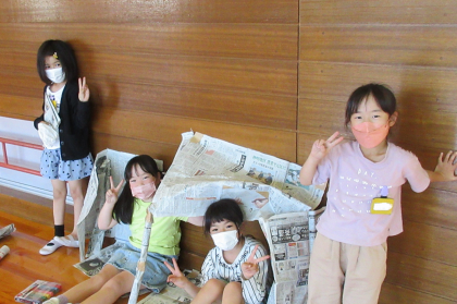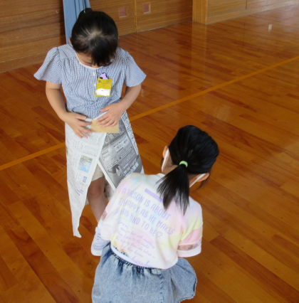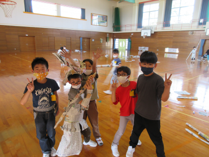 今日は新聞紙を「丸める」「つなげる」「くしゃくしゃにする」などをして形を変え、作品を作りました。子供たちは自由な発想で、服やよろい、家など、面白い作品に仕上げていました。