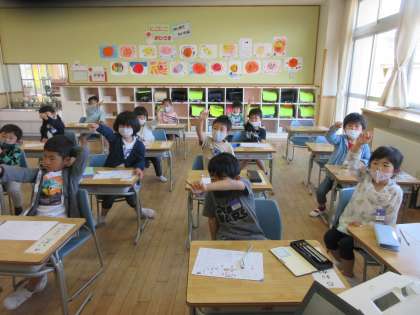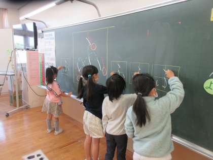今日は、ひらがな「ふ」の字の練習をしました。「ふ」は書き順、形とも難しいです。指での空書きに加えて、鼻で空書きをして頭を振りながら、体を動かすことで書き順を覚えていきました。最後には、前に出て黒板に一人一人が「ふ」の字を書いて、正しい書き順を身に付けたか確認しました。