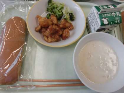 今日の給食は、黒糖コッペパン・牛乳・鶏肉のマーマレードソースかけ・イタリアンサラダ・ビーンズポタージュです。鶏肉のマーマレードソースかけは、マーマレードソースが鶏肉にからんでおいしかったです。黒糖コッペパンは、久しぶりに見かけました。子供たちも、いつもと違うコッペパンに興味津々の様子でした。