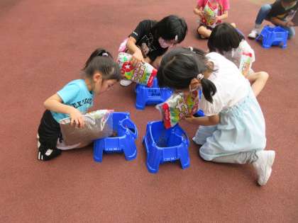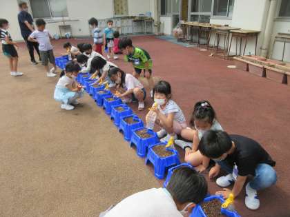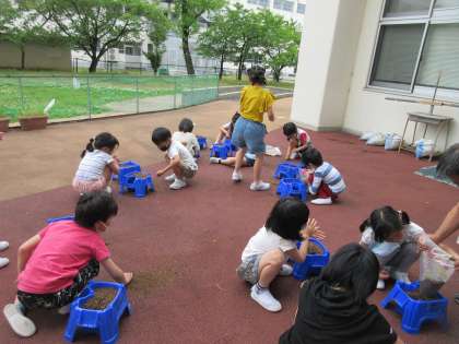 今日は、あさがおを植えました。午前中に、何を準備して、どんなことに気を付けて植えるかや、どんなお世話をするかなどを話し合い、種を観察しました。そして、午後。土を鉢に入れ、種をまきました。「元気に育ってね」「いろいろな色の花が咲いてね」などをあさがおの鉢に向かって話しかけながら水をやる姿がとても可愛かったです。