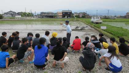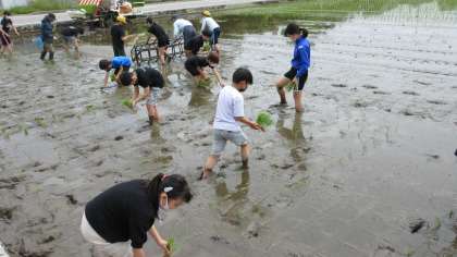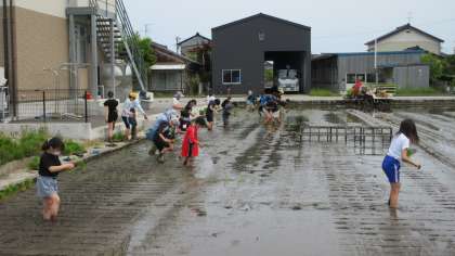 柳寺協業組合の方に教えていただいて、田植えの体験を行いました。最初は田んぼに入ることに戸惑っていた子供たちでしたが、慣れてくると手際よくコシヒカリの苗を植えることができました。