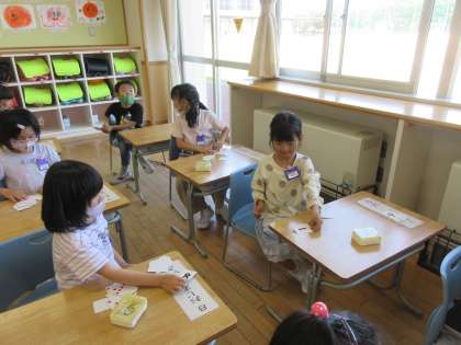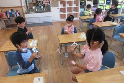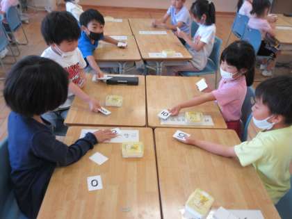 席替えに伴って、隣のペアや生活班で、数カードを使ったゲームをしました。大きさを競ったり、同じ数のカードになるように何回も出したりと、とても楽しそうでした。