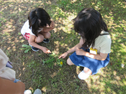 国語科では「たんぽぽのちえ学習学習をしています。そこで休み時間にたんぽぽを探しに行く子供たちもいました。咲いているたんぽぽを見付けると嬉しそうに観察していました。
