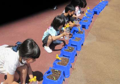 子供たちは、朝の準備をした後であさがおの水やりをしていますが、準備に手間取って水やりができないことがあるので、みんなで対策を話し合いました。子供たちから「前の日の帰りに、ペットボトルに水を満タンに汲んで帰ればいいよ」とか、「水をやったら、必ず追加していつも満タンにすればいいよ」とか「時間がないときは、ペットボトルに入れる水の量を少なくしてやればいいよ」と対策案が出てきました。自分たちのあさがおを、大切にみんなで育てたいというやる気を感じ、とても嬉しく思いました。写真は、話し合いの後で、下校前にペットボトルの水を満タンにする子供たちの様子です。