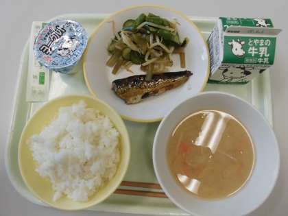 今日の献立は、ご飯・牛乳・いわしのしょうが味・茎わかめサラダ・しらたま汁・ヨーグルトです。