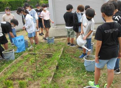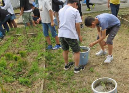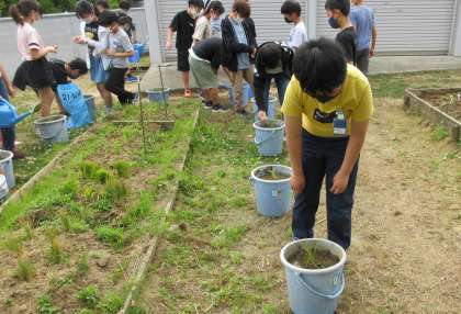 5月20日の田植えの時に、お米の苗を分けてもらいました。学校でも、バケツや畑で育てています。肥料をまいたり、水を補充したりしました。