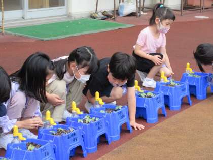 昨日のひどい雨風。あさがおはどうなったのか、みんなとっても心配しながら登校しました。早速、あさがおを見に行き、様子を話し合いました。芽についている黒い粒は土なのか、種の殻なのか話し合ったり、芽が折れたのか、葉に穴が開いているのは大丈夫か、心配した思いを伝え合ったりしました。子供たちの思いの中に、あさがおの命に対する温かい心を感じました。