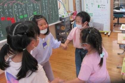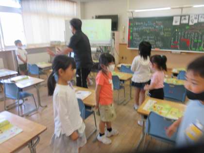 音楽では、「セブンステップス」という曲の鑑賞をしました。途中でリズムに乗って手を合わせて、友達と笑顔で踊っていました。