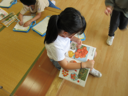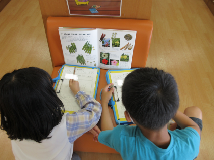 生活科では、野菜を育てています。もっと大きく育つにはどうすればいいかと図書室で調べました。