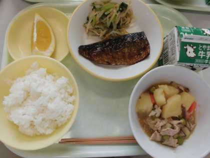 今日の給食は、ごはん・牛乳・豚肉の南蛮煮・こうみ和え・さばの塩焼き・かわちばんかんです。こうみ和えは、ねぎとしょうがの風味がきいていておいしかったです。かわちばんかんは、スッキリとした味わいでした。