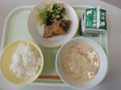 今日の献立は、ご飯・牛乳・魚の竜田揚げ・小松菜のおひたし・呉汁です。