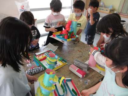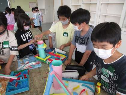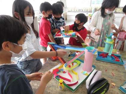 図工で製作していた「コロコロガーレ」が完成し、工夫したところや見てほしいところを発表しました。その後、面白く工夫されたコースに、実際にビー玉を転がしてみました。