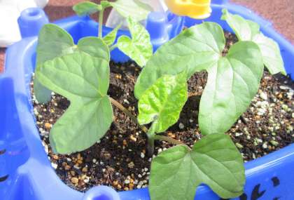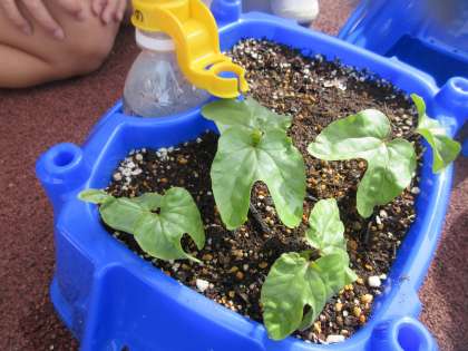 朝、あさがおに水やりをした子供の中から、「葉っぱと葉っぱの間から角が出てきたよ。何かな?」という発言がありました。別の子供から「それ新しい葉っぱだと思うよ」「僕のあさがおからは、3枚目の葉っぱが出ていたよ」との発言もあり、みんなで見に行くと、角の正体は新しい葉だと分かりました。子供たちの観察眼、疑問に思う心、とってもすてきです。