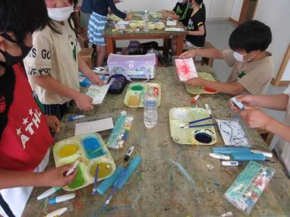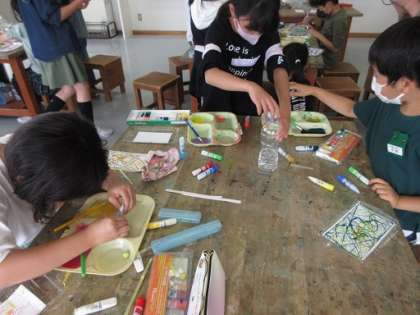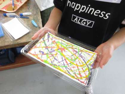 図工の時間に、ビー玉やストロー、ブラシを使い、絵の具で模様を作りました。