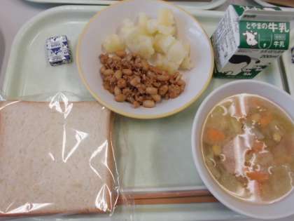 今日の給食は、食パン・牛乳・キャベツスープ・チリコンカン・こふきいも・ポケットチーズです。チリコンカンとは、アメリカのメキシコ州発祥で、牛肉や豚肉と豆をチリソース(唐辛子やトマトソース)で煮込んだ少しスパイシーな料理です。今日の給食のチリコンカンには、豚ひき肉や白いんげん豆が入っています。また中濃ソースとトマトケチャップで味付けしてあるので、子供たちも食べやすい味付けでした。
