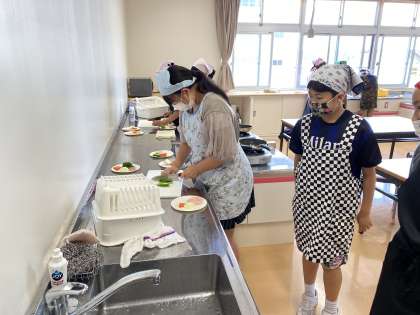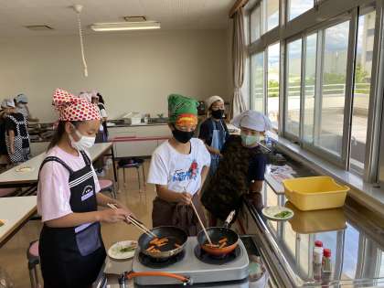 調理実習でいろどりいためを作りました。包丁を使って野菜を切ったり、切った食材を炒めたりしました。うまくいかないときは、どうしたらよいかをグループの友達からアドバイスをもらいながら活動していました。