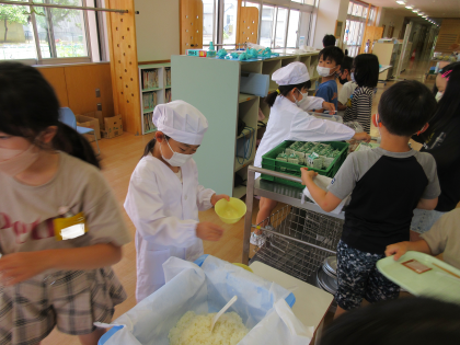 給食準備の様子です。準備係・給食当番・片付け係に分かれて準備をします。子供たちで声を掛け合ってがんばっています。