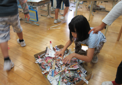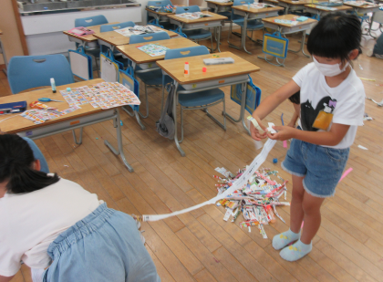 図工では、細長い紙を使って、つなげたり、つるしたりしました。たくさんつなげて長くしたり、つるした紙を合体させたりするなど、様々な工夫がありました。最後は、家のような形になり、みんなで中に入りました。