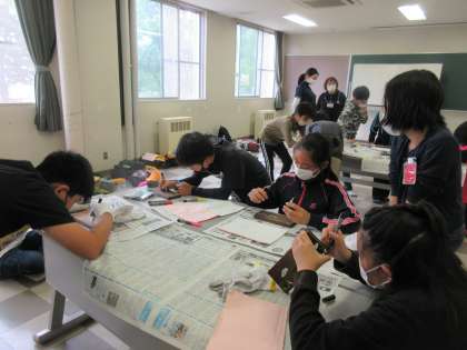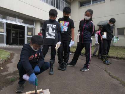 焼き板づくりでは、生木を焼き、カラーテックスやポスターカラーを使って思い出の作品を作りました。