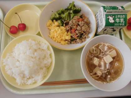 今日の給食は、ごはん・牛乳・豆腐スープ・ゆでブロッコリー・豚そぼろ・いり卵・さくらんぼです。豚そぼろは、人参・ピーマン・玉ねぎが入っていて彩りがよいですね。