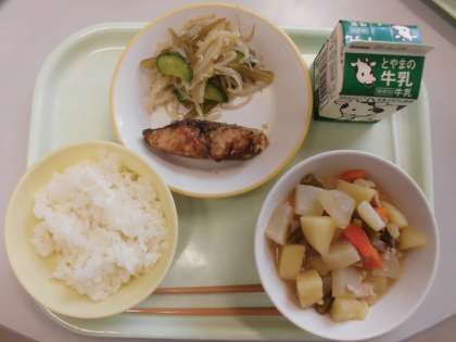 今日の献立は、ご飯・牛乳・魚の梅風味かば焼き・茎わかめの中華和え・じゃがいものみそ煮込みです。