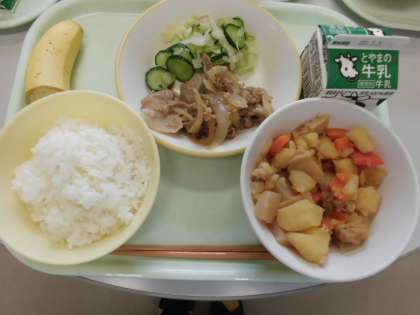 今日の給食は、ごはん・牛乳・たきあわせ・きざみ和え・豚肉のジャンロー・バナナです。豚肉のジャンローは、豚肉と玉ねぎを砂糖・しょうゆ・酒・しょうが・白ごまで味付けしてあります。ごはんがすすみますね。