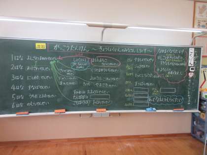 生活科の学校たんけんでは、いよいよ学校の教職員に目を向け、知っている先生や職員の方の名前を発表し合いました。その話合いの中から、自分たちが聞きたいこと、逆に伝えたいことを考え、どんな活動をしたいかを考えていました。