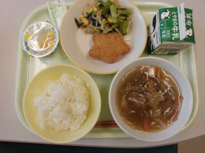 今日の献立は、ご飯・牛乳・星形メンチカツ・コーン和え・天の川スープ・七夕デザート(七夕ゼリー)です。