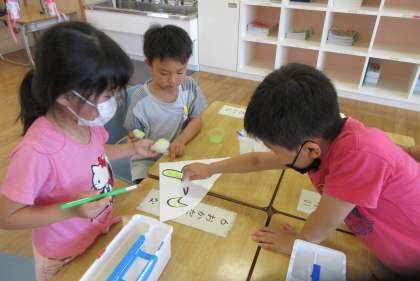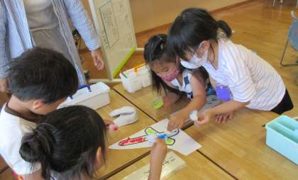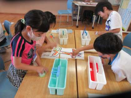 今日は、クラスの看板作りの仕上げを、みんなで絵の具を使って行いました。好きな色を一人1個決めて、グループ担当の字に色をつけました。グループで和気あいあいと行いました。