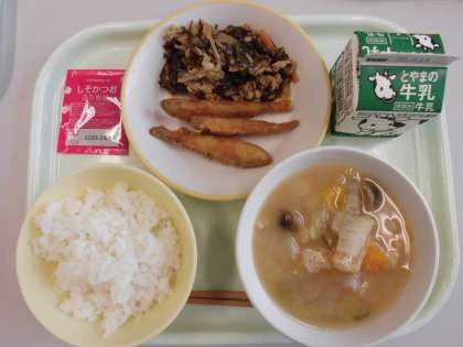 今日の献立は、ご飯・牛乳・わかさぎのフリッター・もずくのチャプチェ・具だくさん汁・しそかつおふりかけです。