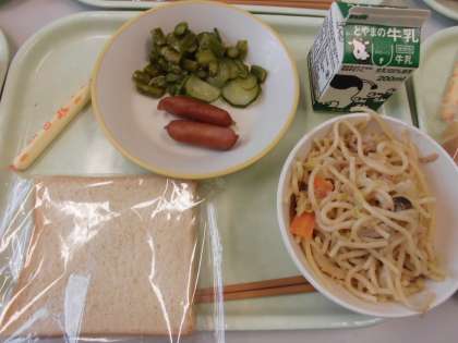 今日の給食は、減量食パン・牛乳・棒チーズ・アスパラサラダ・あらびきウインナー・ツナとキャベツのスパゲッティです。スパゲッティは、コンソメとしょうゆで味付けしてあります。レモン果汁を少し加えることで、さっぱりとした味わいになります。子供たちも久しぶりのスパゲッティに喜んでいました。