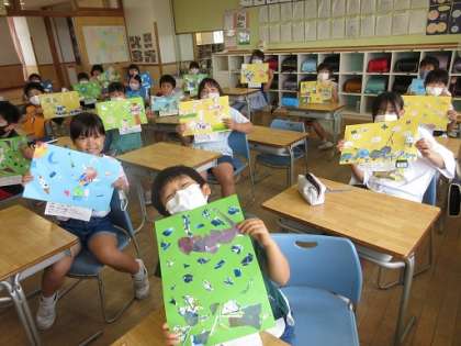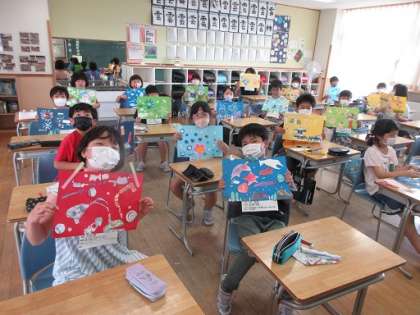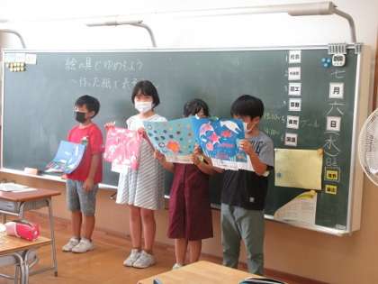 図工の時間に、「作った紙で表そう」の作品紹介をしました。筆を使わずにビー玉やスポンジ、ストローを使って模様のある紙を作りました。その紙を切ったり組み合わせたりして、みんなそれぞれにすてきな世界を表現しました。
