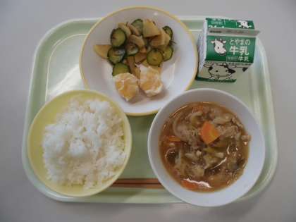 今日の献立は、ご飯・牛乳・韓国風すきやき・昆布和え・にんじんシューマイです。
