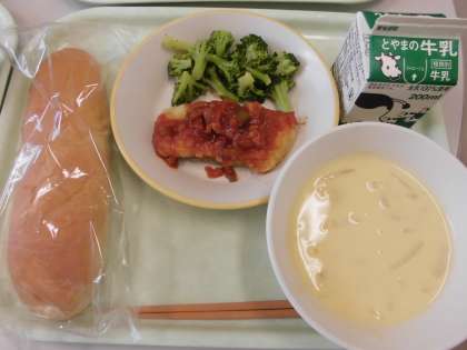 今日の給食は、コッペパン・牛乳・コーンポタージュ・ゆでブロッコリー・さかなのチリソースです。コーンポタージュは、まろやかな味わいでおいしかったです。コッペパンとの相性もバッチリでした。