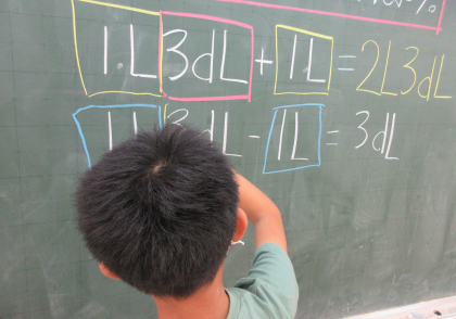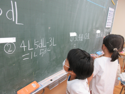 水のかさを計算している様子です。同じ単位のかさを計算するよう気を付けています。1学期の算数の学習も終わりに近づいています。最後までがんばりましょう。