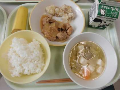 今日の給食は、ごはん・牛乳・つみれ汁・ごまポテト・あっさりチキン・バナナです。ごまポテトは、じゃがいもに白すりごまと白粒ごまが入っています。ごまの風味が感じられておいしかったです。