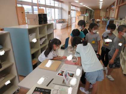登校日に、子供たちは学校に来ると夏休みの思い出を話し合ったり、友達の夏休みの作品を見合ったりしました。元気な姿を見ることができてとてもうれしいです。