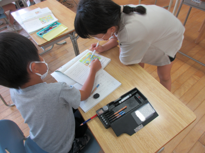 今日は、「ことばでみちあんない」の学習をしました。目印を教えたり、道筋を順序よく話したりして、相手にうまく伝えようとがんばりました。