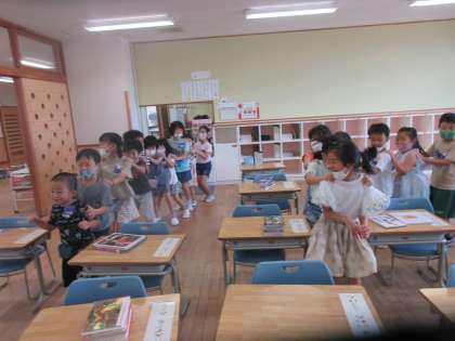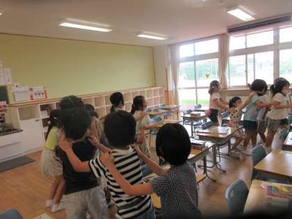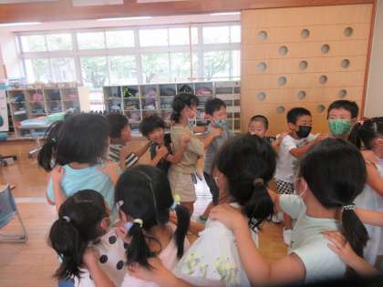 音楽の時間に「白くまのジェンカ」をしました。じゃんけんをして、列をつくっていきました。最後には、みんなで一つの輪になって、楽しくジェンカをしました。