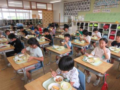 感染症を予防するために、給食時間は前を向いて、黙食を続けています。友達とおしゃべりしながら食べる方がおいしいのですが、がんばっています。