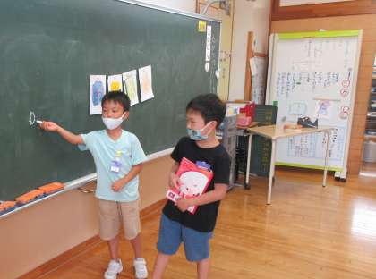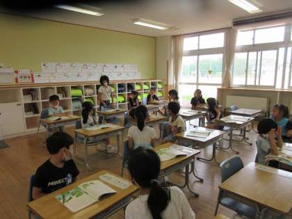 今日は、朝の会や国語の授業で、子供たちがすてきな意見を交換していました。朝の会では、日直のスピーチで「好き好き」という発表を受けて「桃に種はあるのか」という話になり、果物によって種の形や大きさが違うことが分かってきました。国語科では「やくそく」という物語から、アオムシたちのけんかを諫める意見や、共感する意見が出て、登場人物の気持ちに迫っていきました。聴き合うと新たな子供の一面が見えていいですね。