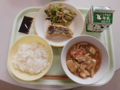 今日の献立は、ご飯・牛乳・ホキの米粉揚げ・のり佃煮・香味和え・豆腐の野菜あんかけです。
