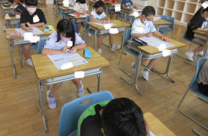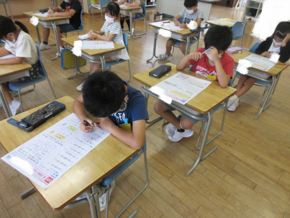 今日、算数科では「工夫して計算しよう」のテストをしました。久しぶりのテストでしたが、子供たちは集中して、最後まで取り組んでいました。