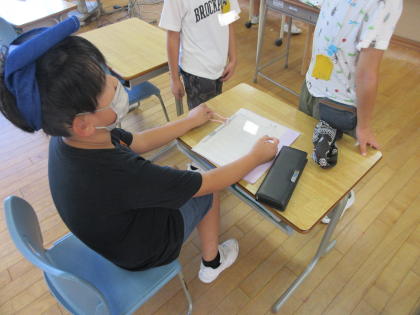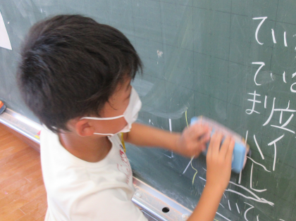 掃除の様子です。2学期からは、掃除の班長を決め、どのように掃除ができたか反省会を行っています。掃除中は、「机を下げるよ」「今日は私が黒板消しをするよ」など、声をかけ合って取り組む姿が見られました。