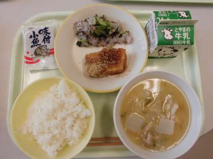 今日の献立は、ご飯・牛乳・揚げ出し豆腐のごまだれかけ・ゆかり和え・豚汁・味付け小魚です。