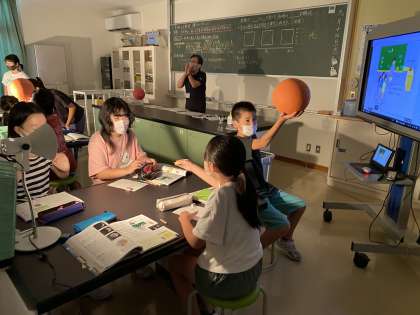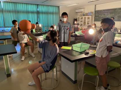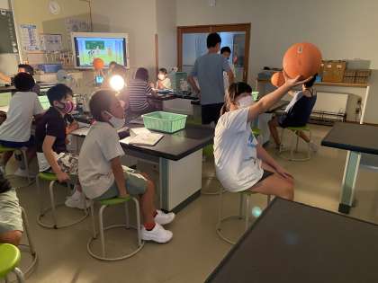理科で月の満ち欠けについて学習しました。ライトを太陽、自分を地球、ボールを月に見立てて、実験しながらどのように月が変化するのかを感じていました。