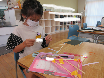 図画工作科では、ストローを使ってパタパタ動く仕組みを作り、いろいろなものを工作しました。カブトムシの角を動くようにしたり、手を振るようにしたり、自由な発想で作りました。