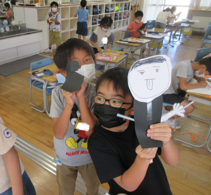 図画工作科では、ストローを使ってパタパタ動く仕組みを作り、いろいろなものを工作しました。カブトムシの角を動くようにしたり、手を振るようにしたり、自由な発想で作りました。