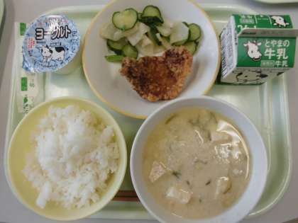 今日の献立は、ご飯・牛乳・豚肉の竜田揚げ・かぶのいろどり・呉汁・ヨーグルトです。
